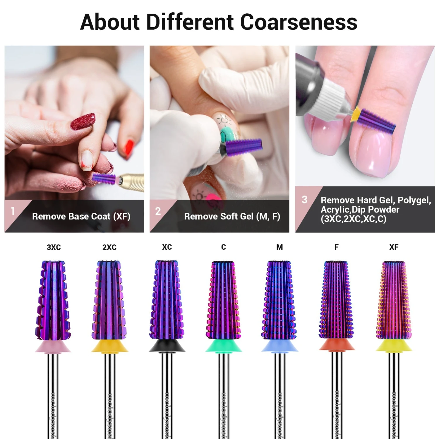 - Multifunctional: Include 5 different functions that can be used to clean the cuticle area, prepare the nail bed, shape and shorten the nail, smooth and remove on the surface, and clean under the nail. The Coarseness on the drill surface changes from top to bottom: Top is for cutting dead skin, 2nd part is Extra Coarse, 3rd part is Double Coarse, and the bottom base is Triple Coarse grit.