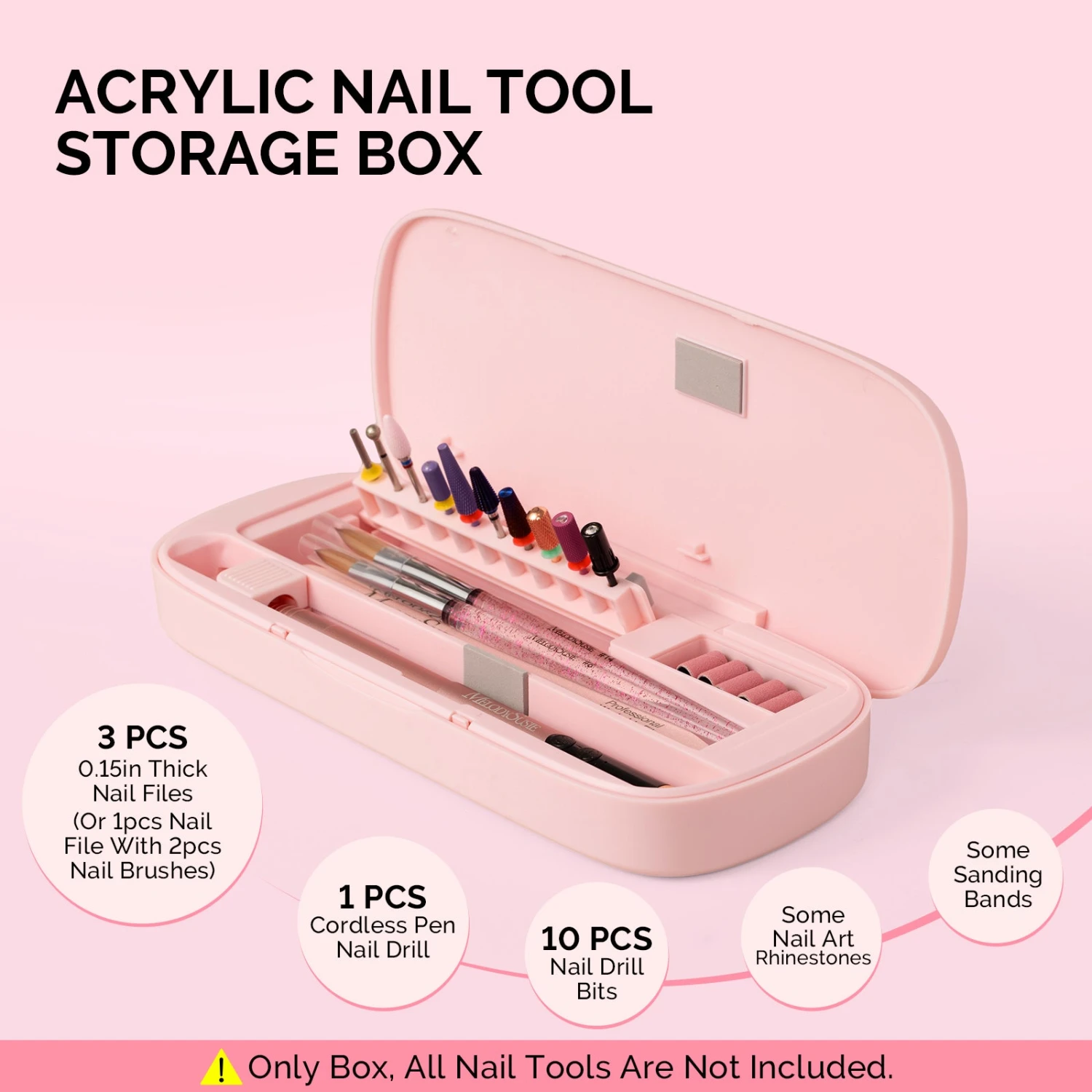 - 2025 New Upgrade Acrylic Nail Tool Storage Box: It can hold 1 cordless pen nail drill, 10pcs 3/32” nail drill bits, 3pcs 0.15in thick nail files(Or 1pcs nail file with 2pcs nail brushes), some sanding bands, some nail art rhinestones to meet your basic nail needs. The box inside is equipped with silicone pads and anti-collision strips, so the nail tools can be held stably no matter how you move the box. Four non-slip pads at the bottom, which are not easy to slide and can place the storage box firmly.