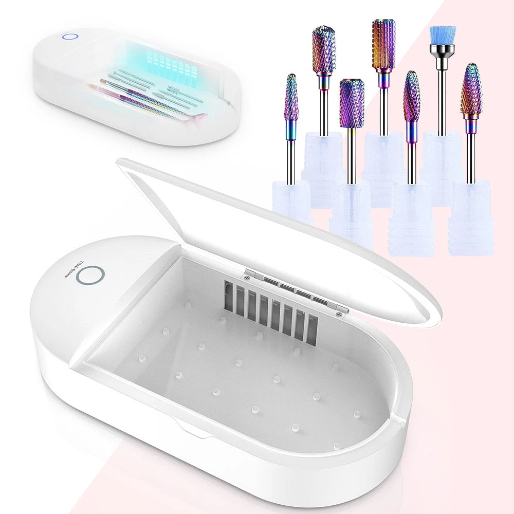 - UV Light Sanitizer: UV-C light that’s known to penetrate and destroy 99.9% of harmful material. Help you to kill bacteria of your nail drill bits and fake nail slices.