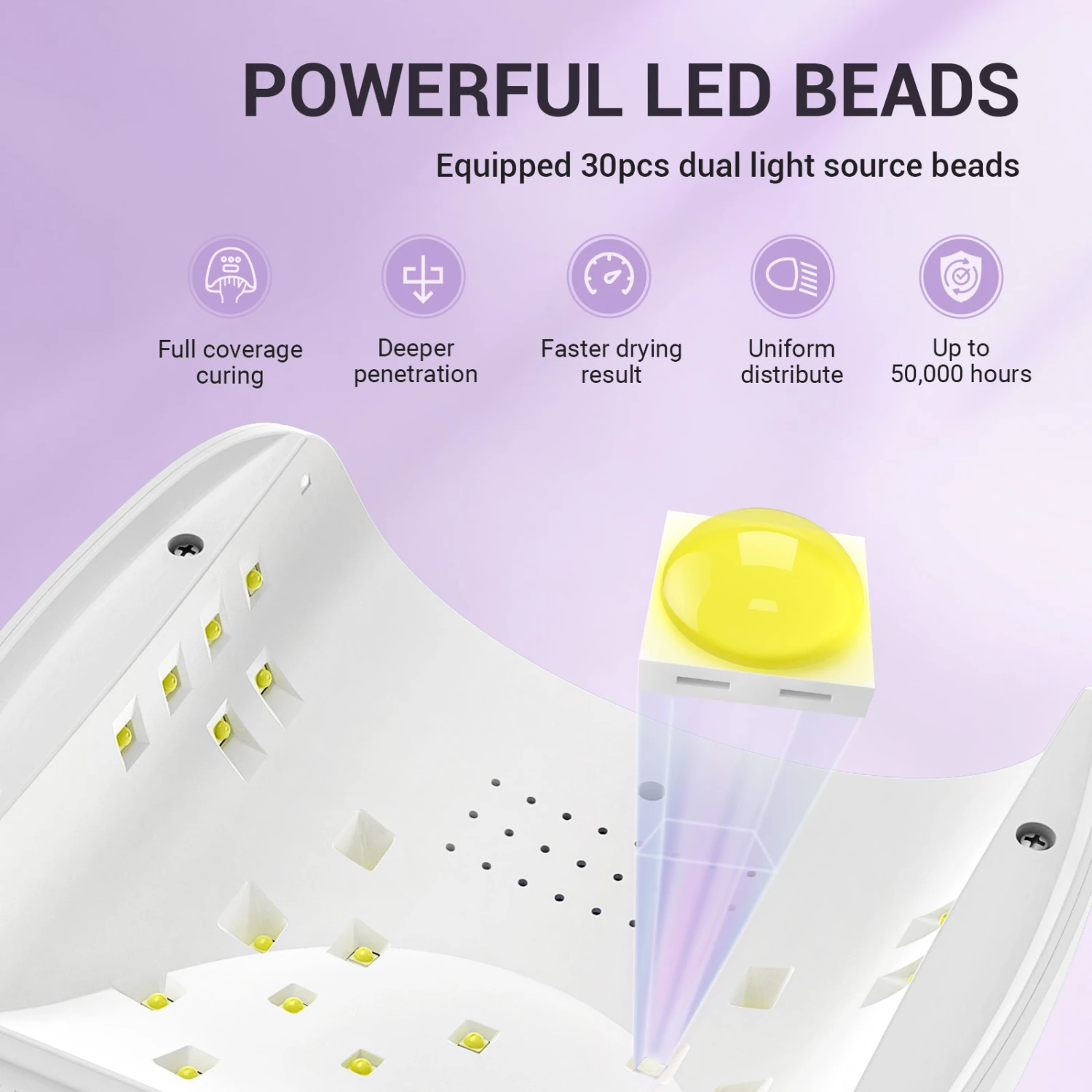 - Best Light Source – equipped with 30 pcs dual LED UV beads with 54 watts high power, low heat, no harm, comfortable, dry your gels fast and efficiently.
