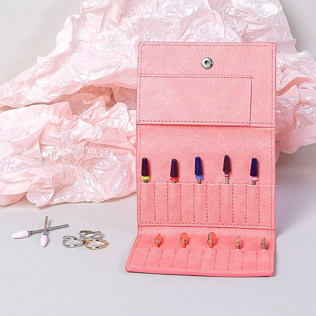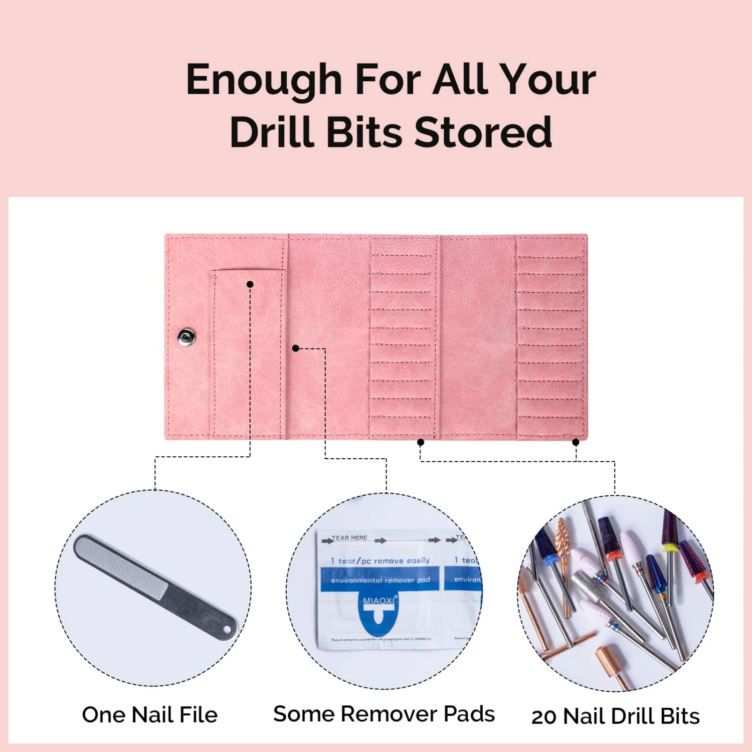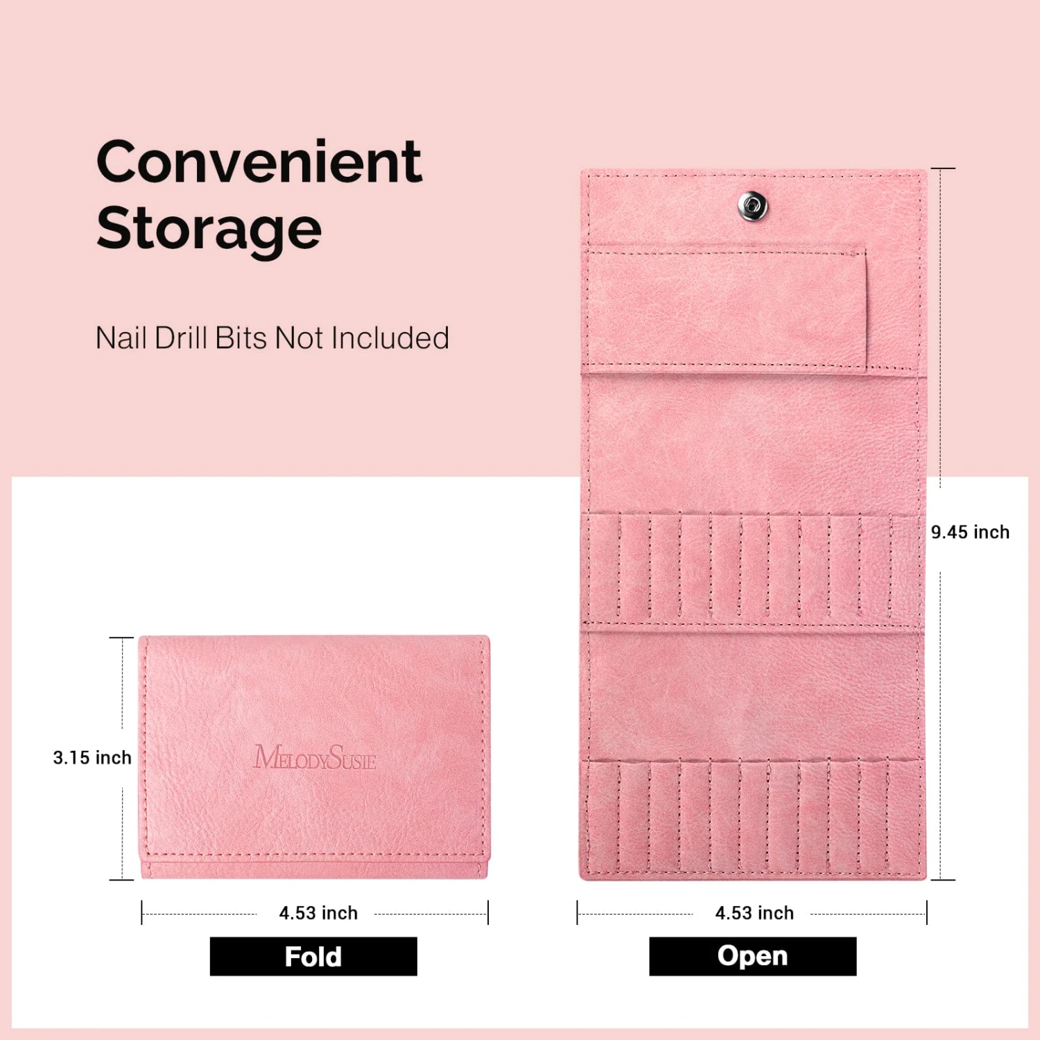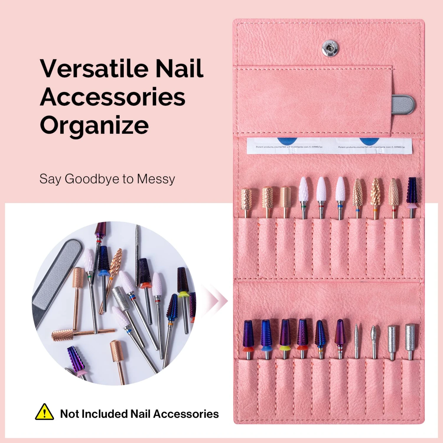 - Practical Pocket: It is tiny but multifunctional. Inside has 22 PU slots for nail drill bits and 1 layer for sanding bands, acrylic nail tips, charging cable, and other accessories.