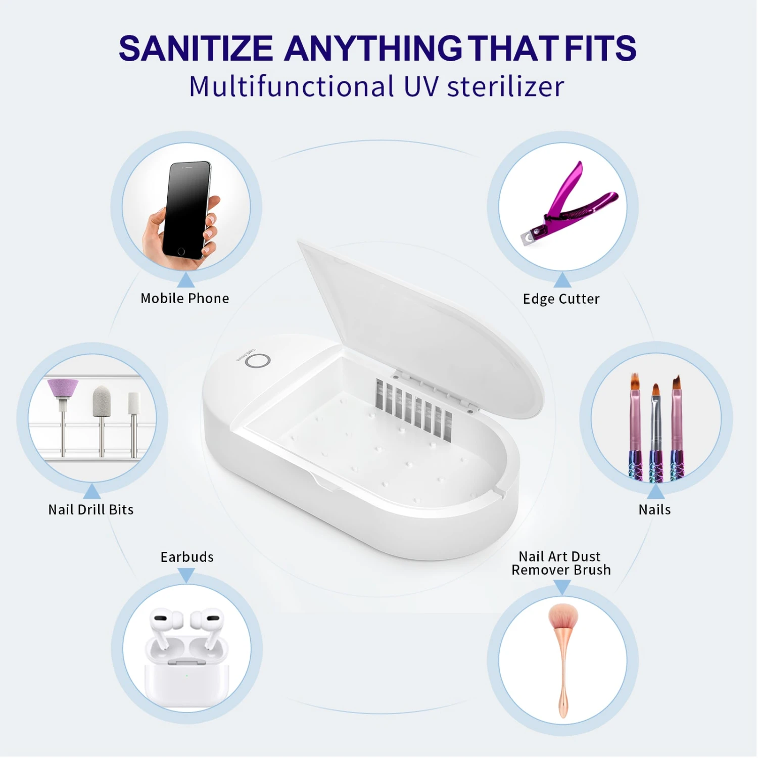 The Nail Tool UV Light Sanitizer Box helps you to kill bacteria that you can’t see on the surface of nail tools, such as nail drill bits, nail dust remover brush, steel edge cutter, fake nail slices, and so on. Besides, it can sanitizer Bluetooth earphones, watches, and any other small objects. Portable and rechargeable. To keep you safe every day.