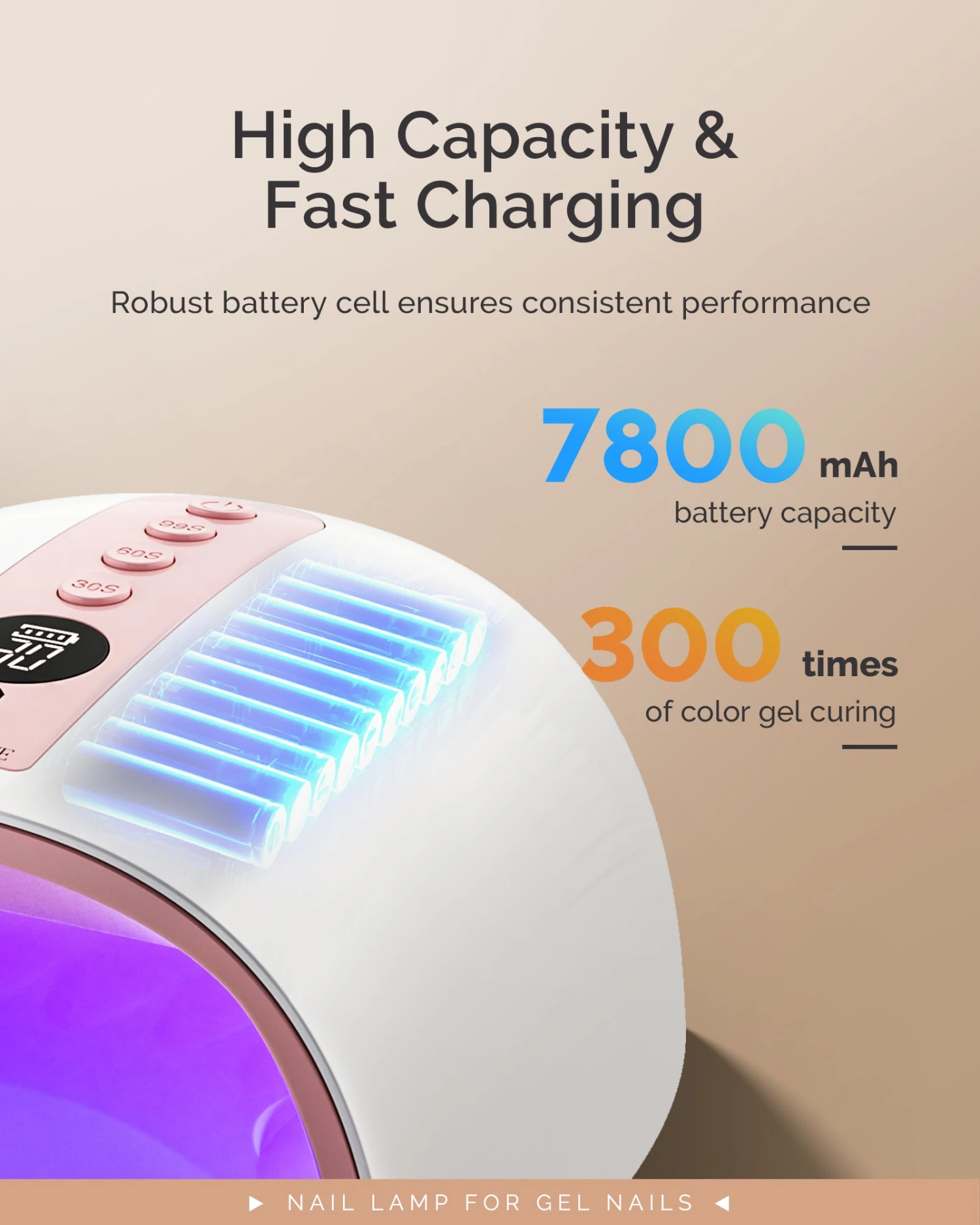 - RECHARGEABLE & CORDLESS: Equipped with a rechargeable 7800mAh built-in battery, this cordless gel nail dryer can cure 300 times of color gel with only 2 hours of full charge. Its cordless design offers maximum flexibility, making it perfect for home, salon, and even outdoor use with no need to stay plugged in!
