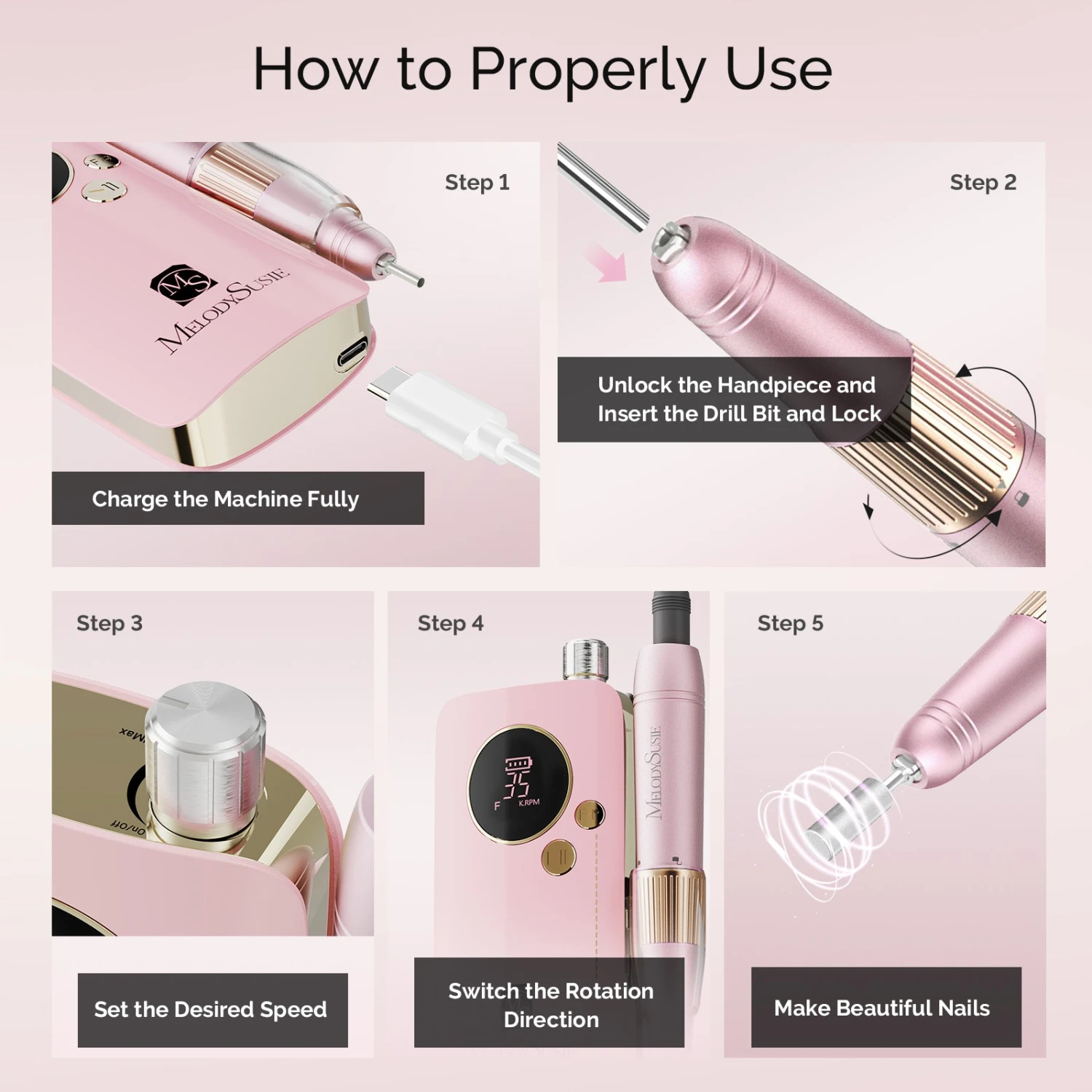 - High Speed Max 35000RPM: This professional nail drill is equipped with high-quality coreless motor, which enables it work smoothly at a high and adjustable speed (0-35000 RPM).