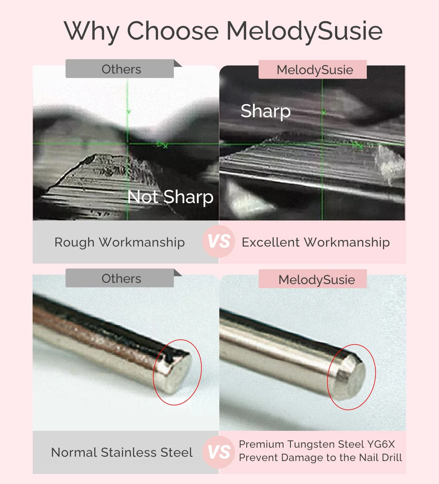 - MelodySusie Tungsten Carbide Nail Drill Bits are made of the best YG6X tungsten carbide material on the market. High-temperature resistance, wear resistance, and strong bending resistance which is more hardest, stronger, and more durable than other materials.