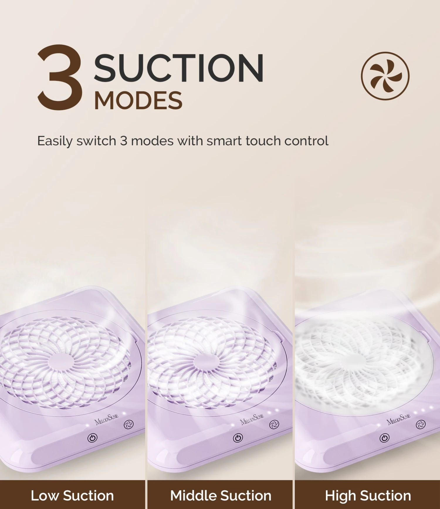 - Adjustable Suction: Powered by a high-quality turbo motor, this nail dust collector offers smooth and comfortable operation while filing. The touch control panel allows effortless switching between LOW, MIDDLE, and HIGH suction levels with just one touch.