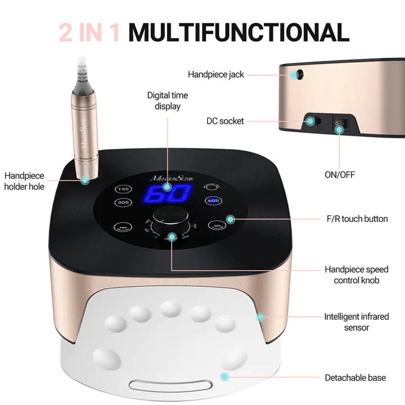 - MULTI-FUNCTION & DETACHABLE: Buy 1 device, enjoy 2 functions. 2 in 1: UV/LED Nail Lamp & Nail Drill. This nail lamp is equipped with a 0-30000RPM powerful nail drill which can be removed easily. You can choose to use the nail lamp separately or together with the drill.